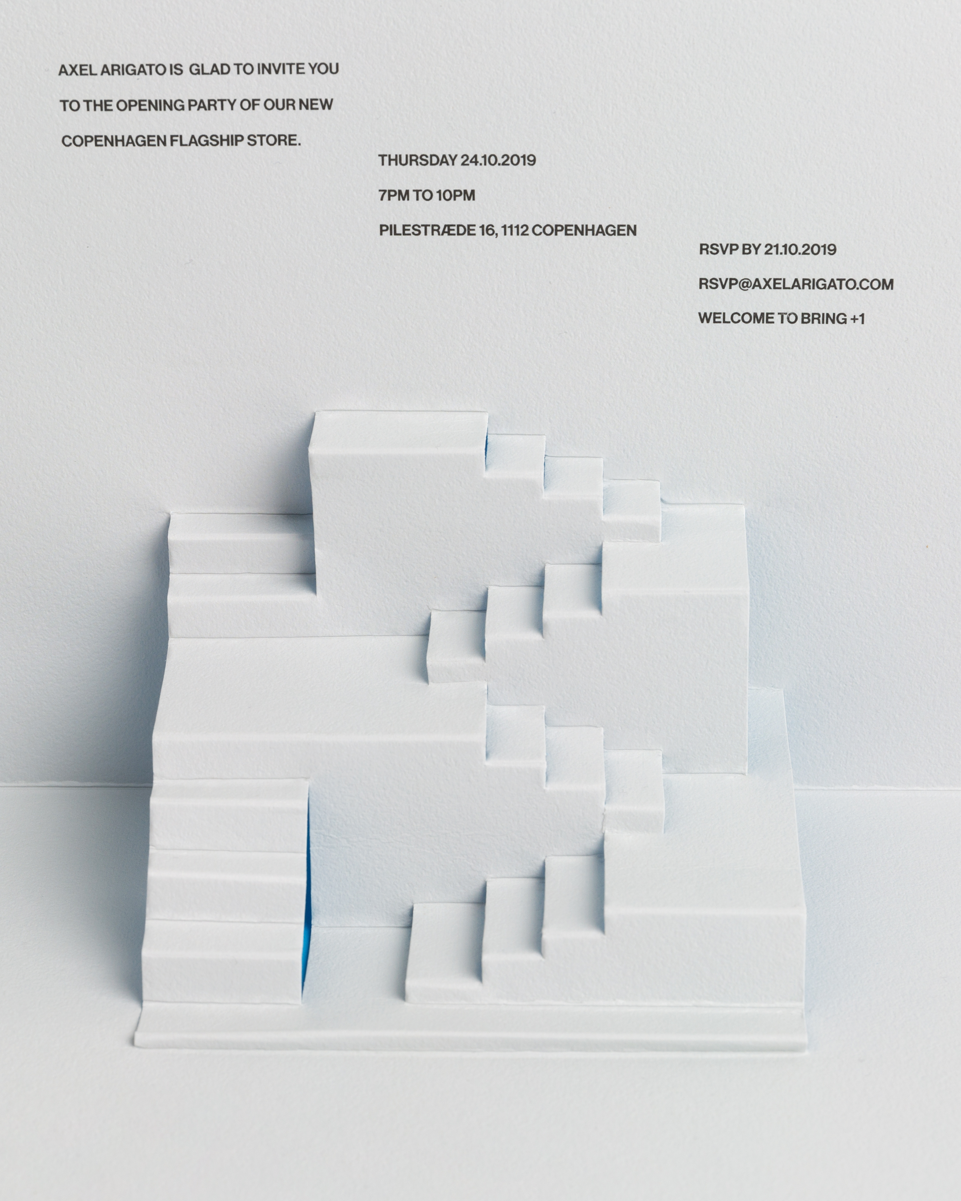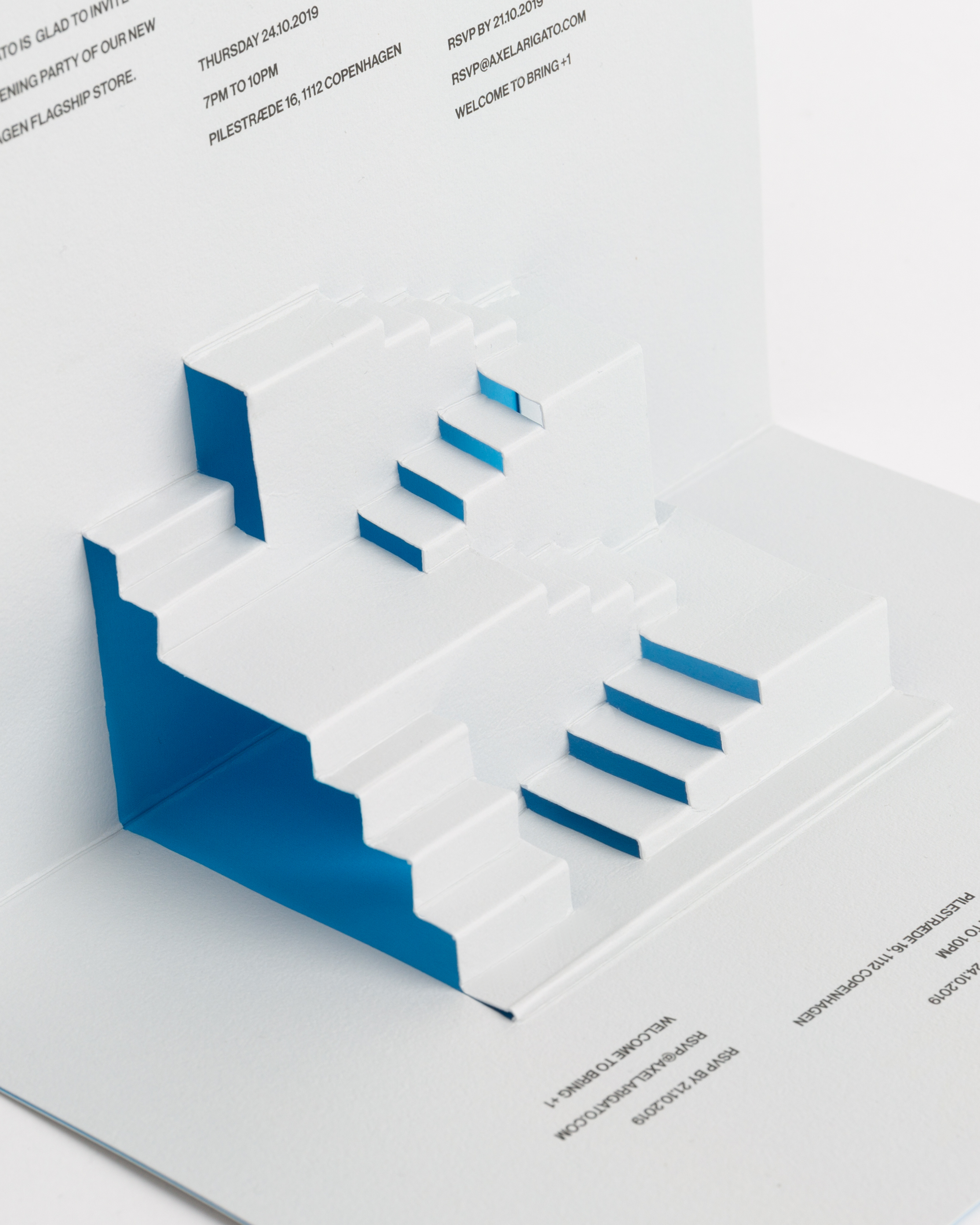 Inspired by the main decor piece in the Axel Arigato store, this invite is a representation of the architectural stair leading up to the second floor.
